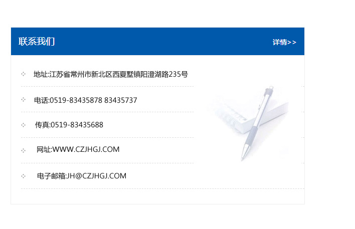 地址:常州市新北區友邦商務大廈1幢16、17層  電話:0519-85101652  傳真:0519-85112595  郵編:213022  網址:www.cz-jiayue_cn.zsliwei.com  郵箱:xiajifengaa@163.com